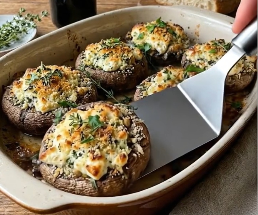 Juicy baked mushrooms filled with a creamy garlic herb cheese stuffing, topped with a light golden crust—perfect as a party appetizer or quick side dish.